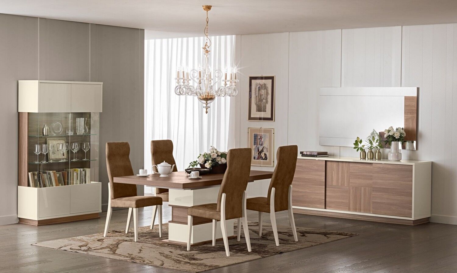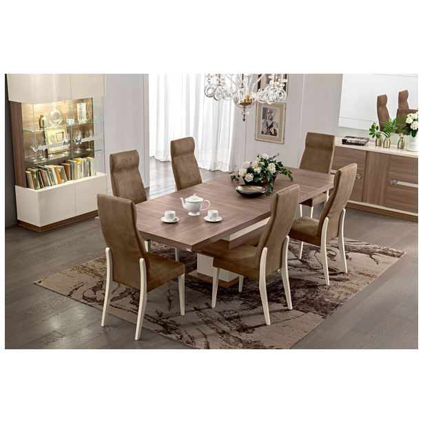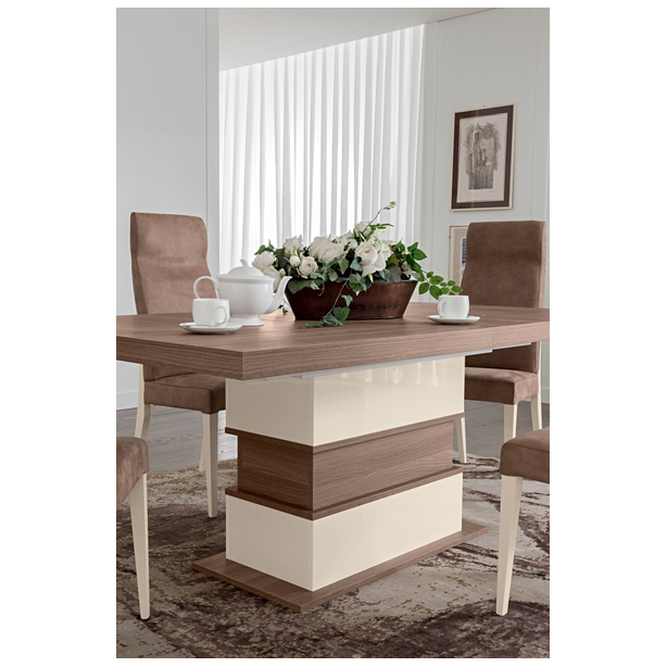 Nowoczesny włoski stół do jadalni Evolution ma piękne drewno i kontrastujące wykończenie w kolorze kości słoniowej. Ten włoski zestaw do jadalni może pomieścić od 4 do 10 osób i jest idealny zarówno dla mniejszych, jak i większych rodzin.