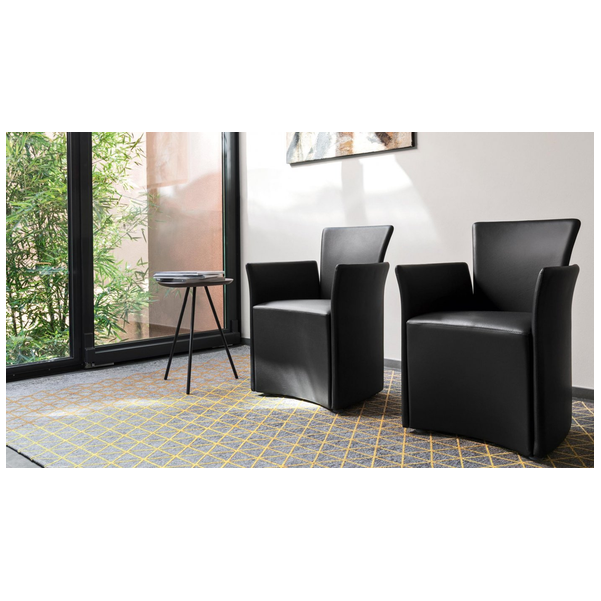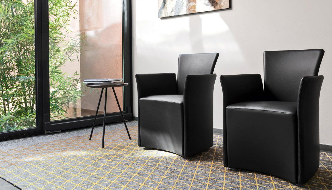 Fotel model Nido z podłokietnikami, w całości tapicerowany. Rdzeń w metalowej rurze został spieniony na zimno poliuretanem, materiałem, który zachowuje swoje właściwości przez długi czas. Aby fotel był wygodniejszy, podstawa siedziska wsuwa się pod środkową część na około 10 cm. Cienki profil z zaokrąglonymi narożnikami i odsłoniętymi szwami biegnącymi wzdłuż boków elementów. Cztery wytrzymałe plastikowe nóżki, ukryte pod podstawą, utrzymują ją uniesioną nad ziemią.