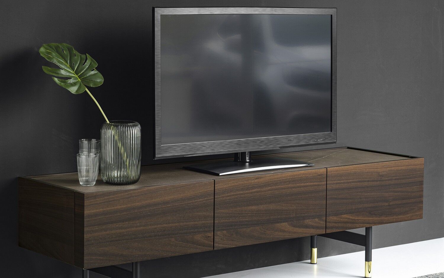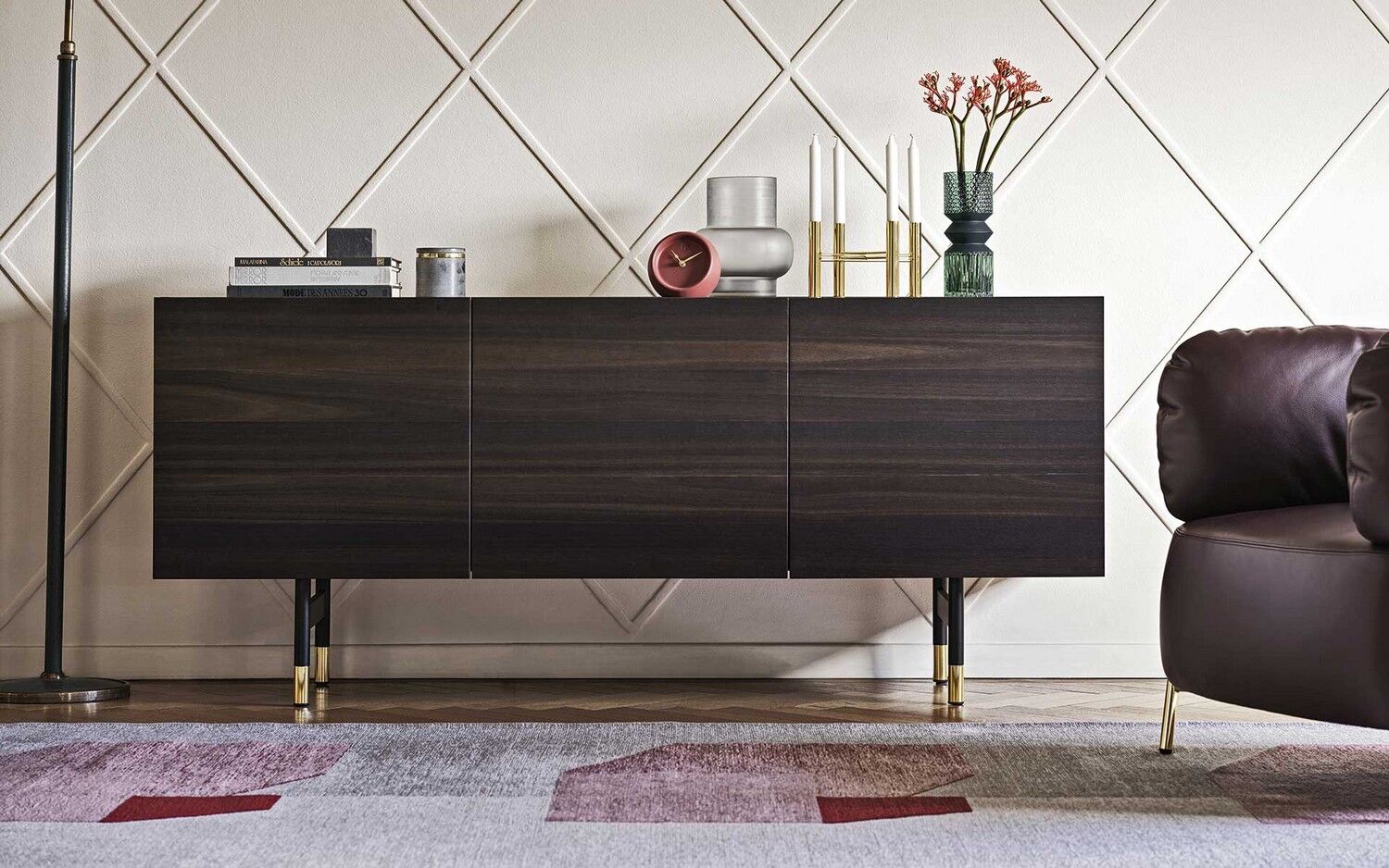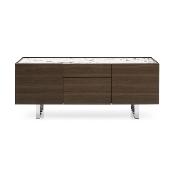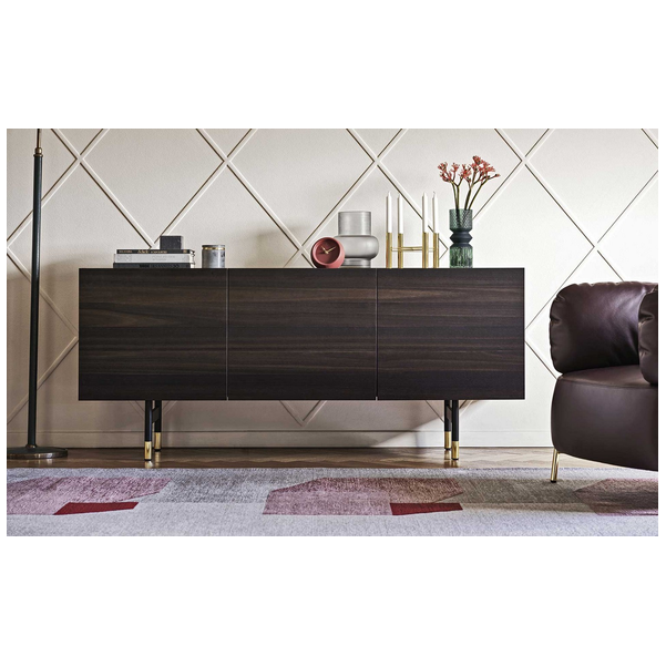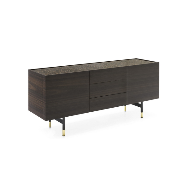 Horizon z 2 drzwiami bocznymi i 3 środkowymi szufladami, konstrukcja drewniana. Centralne szuflady bez uchwytów są wyposażone w system otwierania push-pull. Wszystkie przedziały są wyposażone w półkę z przezroczystego hartowanego szkła. Horizon wzbogacony jest o szklaną lub ceramiczną górną półkę oraz elegancką metalową podstawę o prostokątnym przekroju. Horizon to duża szafka do przechowywania, która idealnie nadaje się do przestronnych i wyrafinowanych jadalni, salonów. Odkryj wszystkie szczegóły!