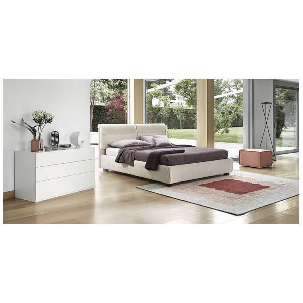 Austin to łóżko ze zintegrowanym wezgłowiem i poduszką. Te dwie miękkie, wygodne poduszki zostały podwyższone za pomocą zakładki, która podobnie jak detal na garniturze staje się znakiem rozpoznawczym produktu, który podkreśla dotykowe piękno skóry i tkaniny. Poziome stebnowanie wyznacza linię łączącą, która łagodzi efekt wizualny i tworzy elegancką wyrafinowaną estetykę łóżka z dodatkową opcją kontenera.