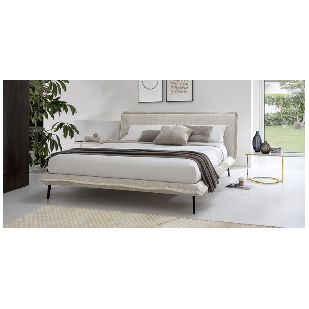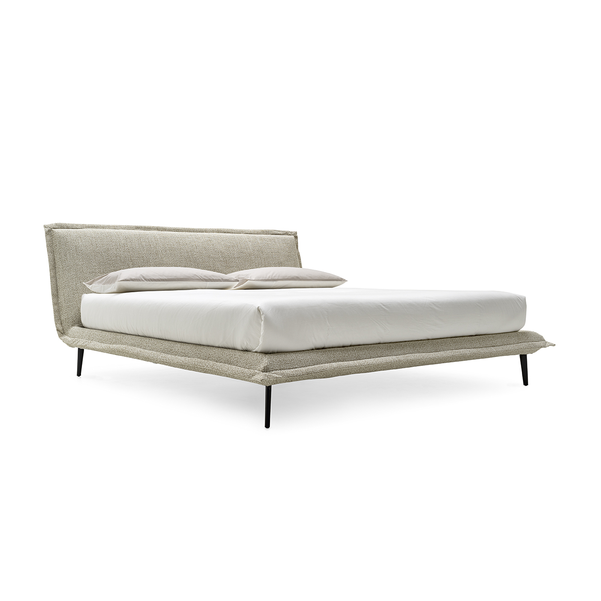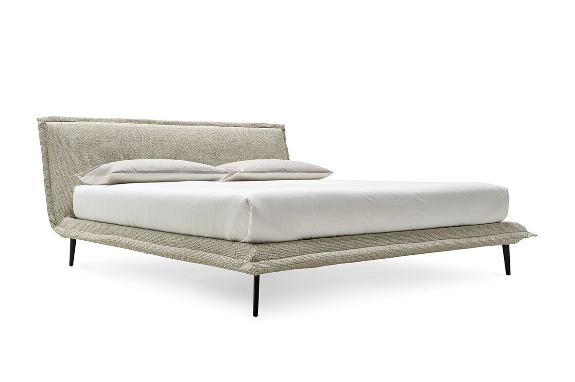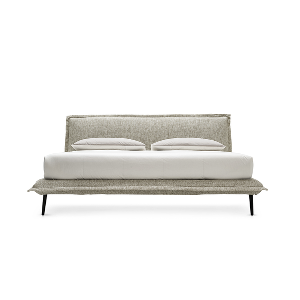 Fluff wyróżnia się trzeźwością i liniową prostotą. Objęte lekką ramą o odpowiednich proporcjach i połączone z zagłówkiem, tworząc jeden korpus połączony niewidocznymi szwami. Materac wydaje się zawieszony w powietrzu, chociaż spoczywa na lekkiej, ale solidnej konstrukcji osadzonej na smukłych metalowych nóżkach. Brzegi całego łóżka zostały obszyte detalem z tkaniny, który podkreśla doskonałą tekstylność produktu.
