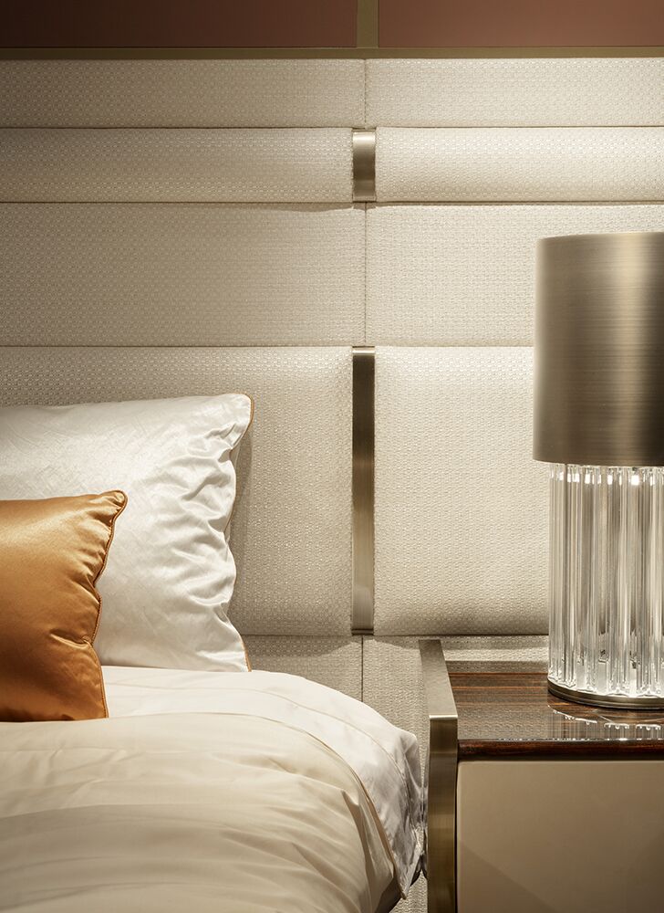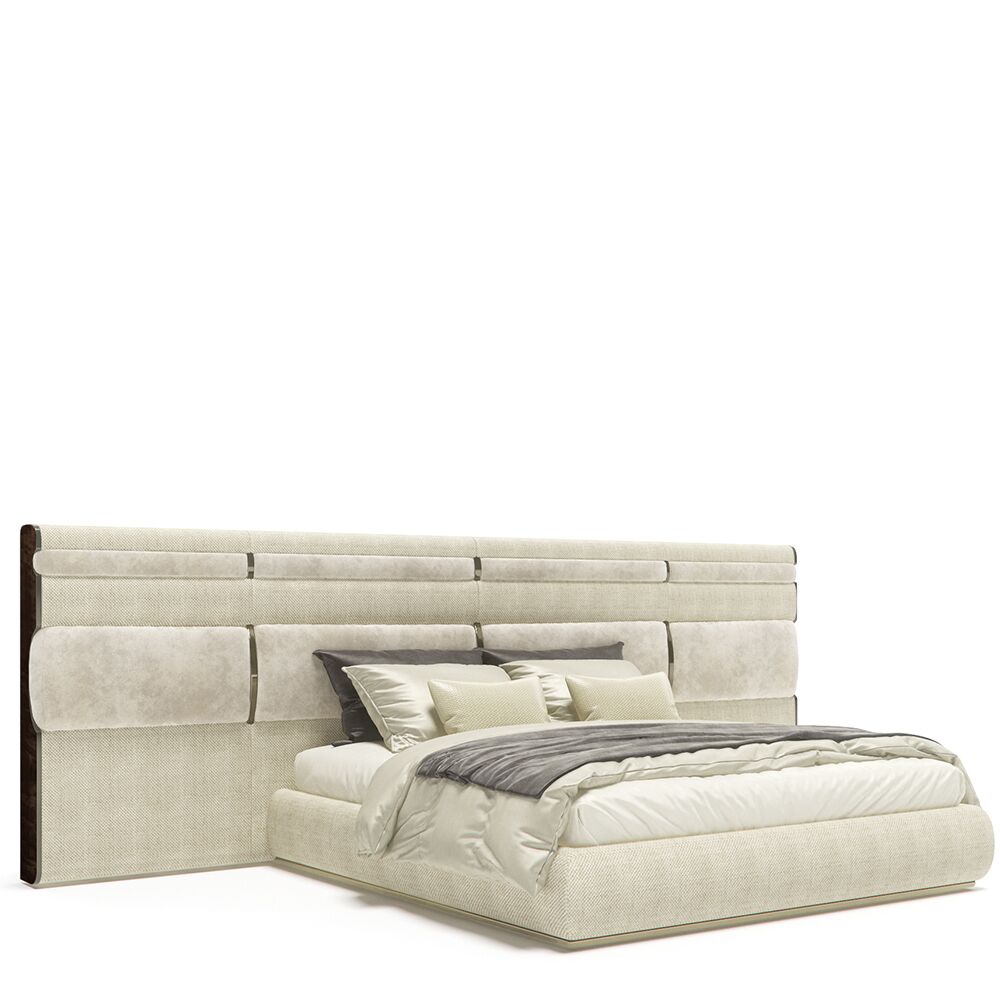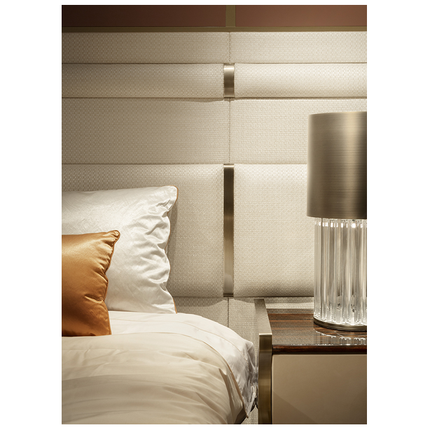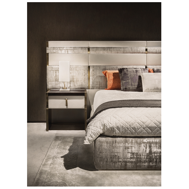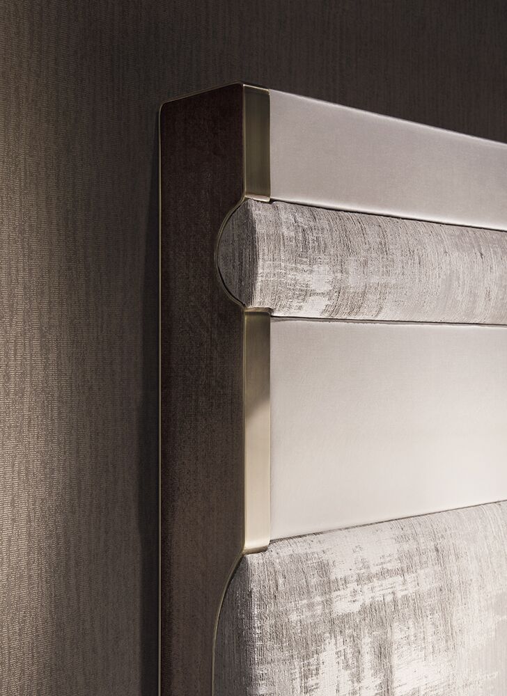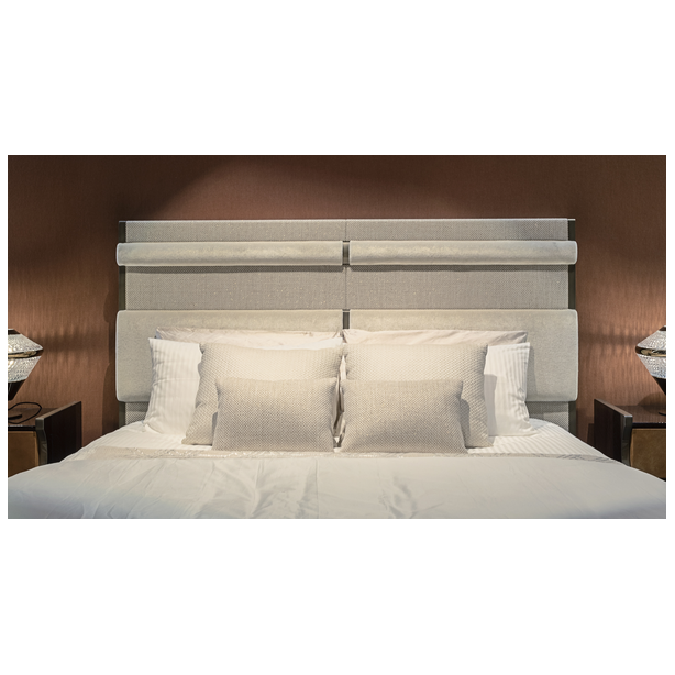 Trilogy to system, który w unikalny i wyrafinowany sposób wyposaża miejsce odpoczynku. Szereg paneli podzielonych metalowym profilem łączy się, tworząc zagłówek, który można dostosować z różnych tkanin i skór. Drewniana rama. Nieodkształcalna pianka poliuretanowa o różnej gęstości.