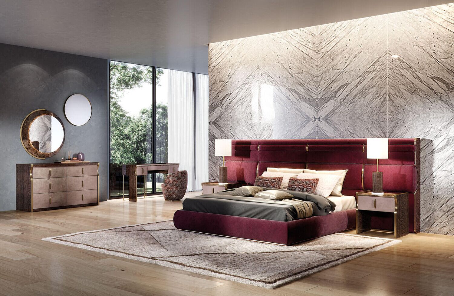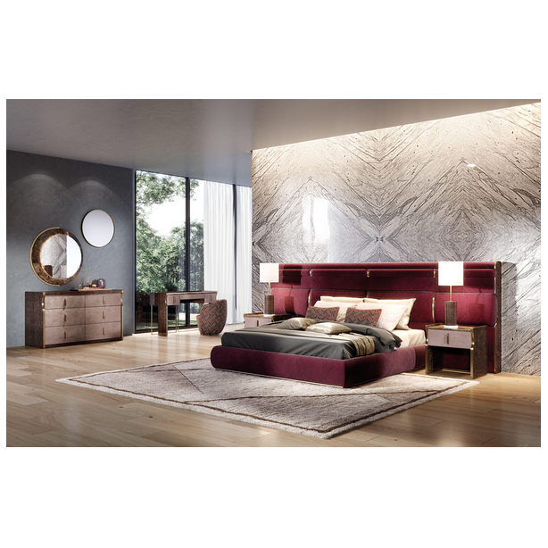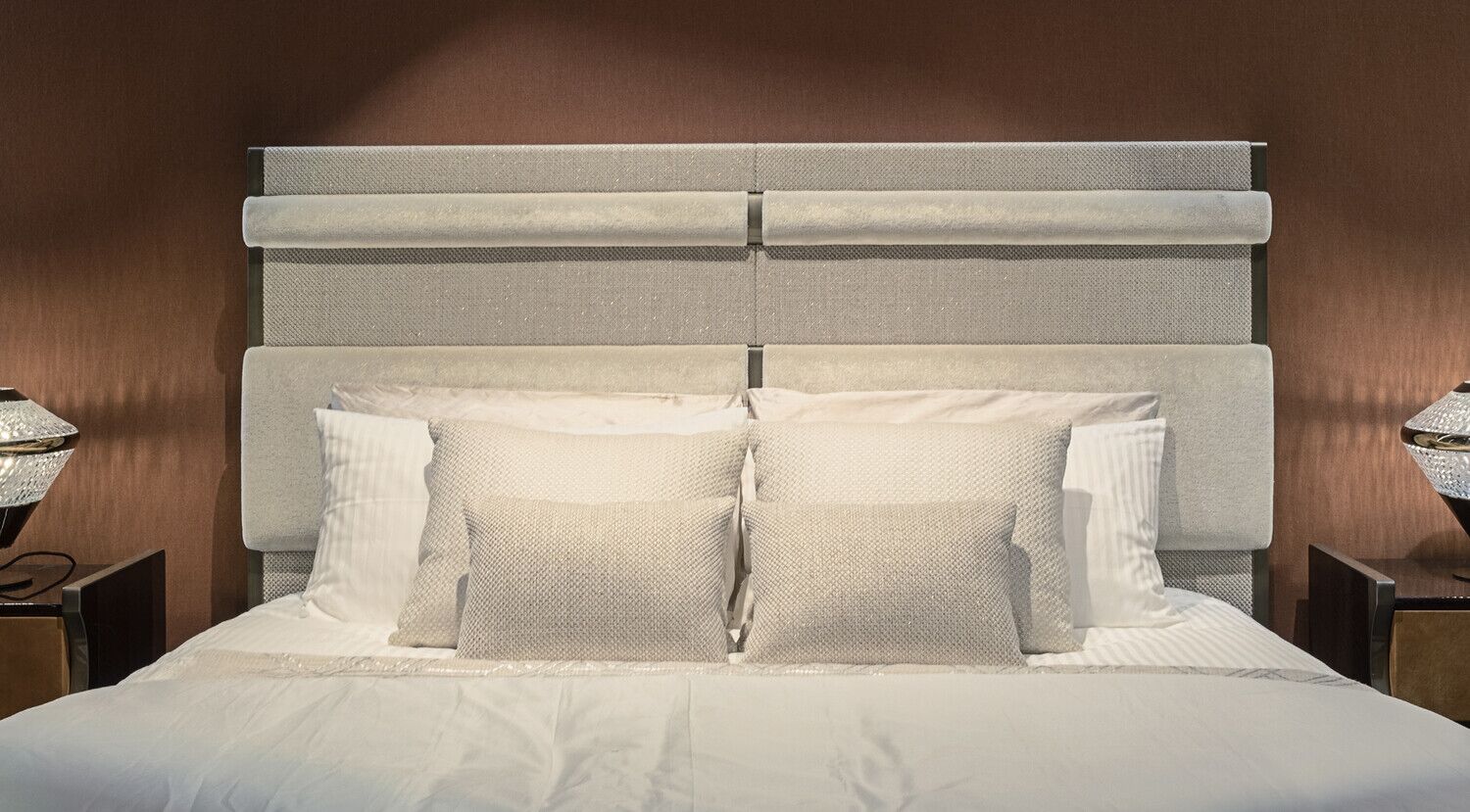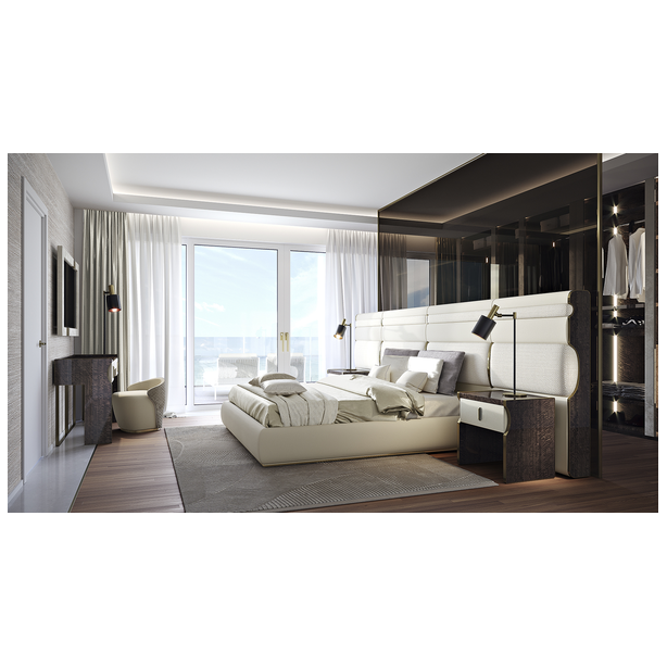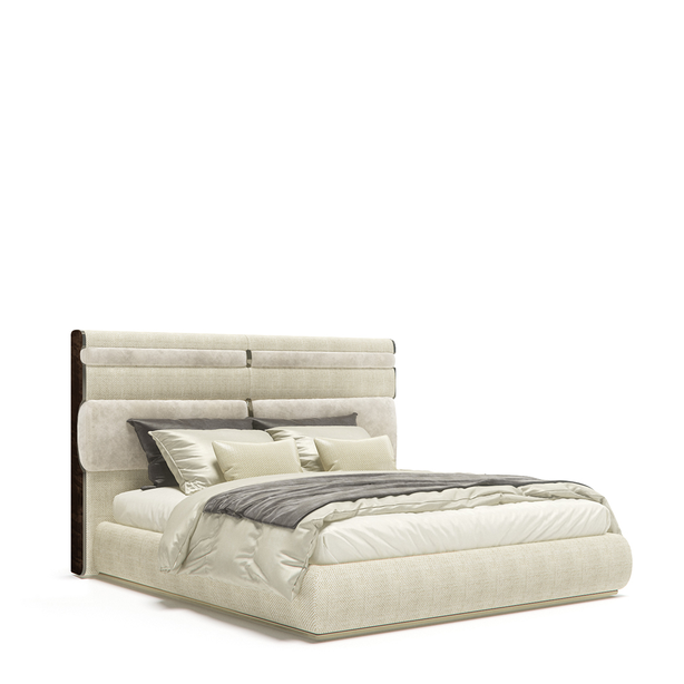 Trilogy to system, który w unikalny i wyrafinowany sposób wyposaża miejsce odpoczynku. Szereg paneli podzielonych metalowym profilem łączy się, tworząc zagłówek, który można dostosować z różnych tkanin i skór. Drewniana rama. Nieodkształcalna pianka poliuretanowa o różnej gęstości.
