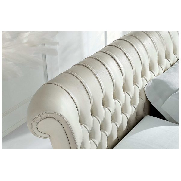 Luksus wkracza do sypialni z łóżkiem Windsor w stylu retro. Cechy szczególne tego modelu to tapicerowane wezgłowie, rama pokryta pikowaną skórą. Łóżko można łączyć z dopasowanym podnóżkiem, który w połączeniu z drewnianym blatem może służyć jako elegancki stolik nocny.