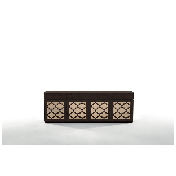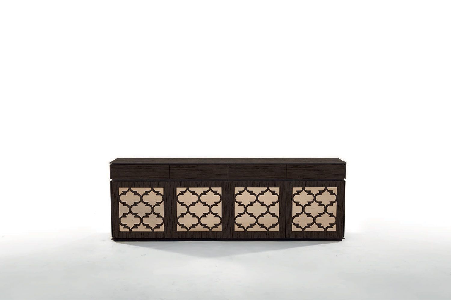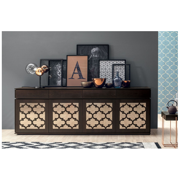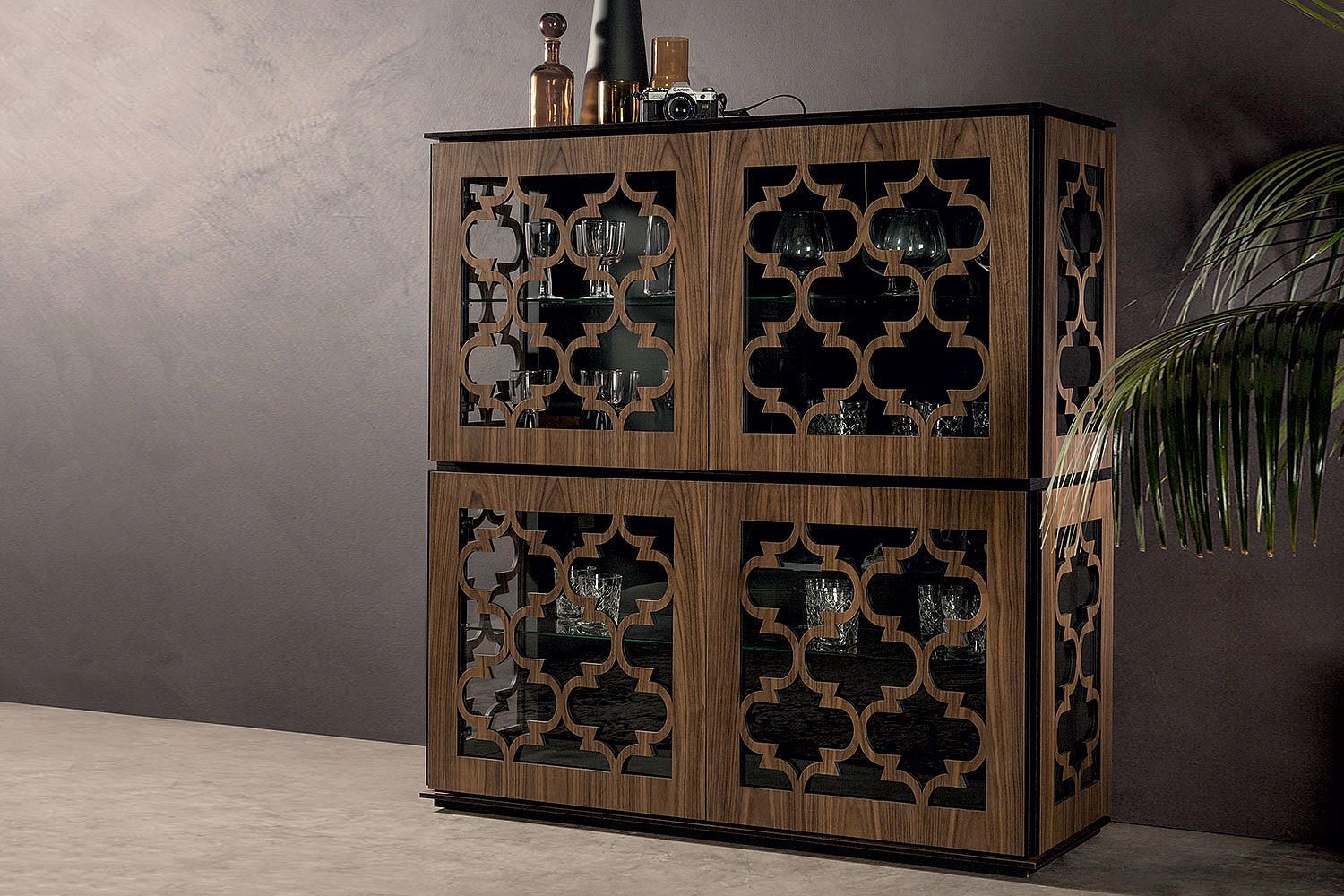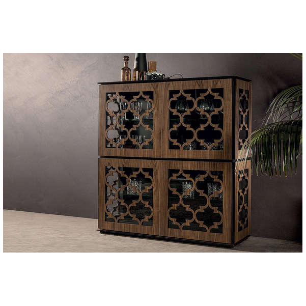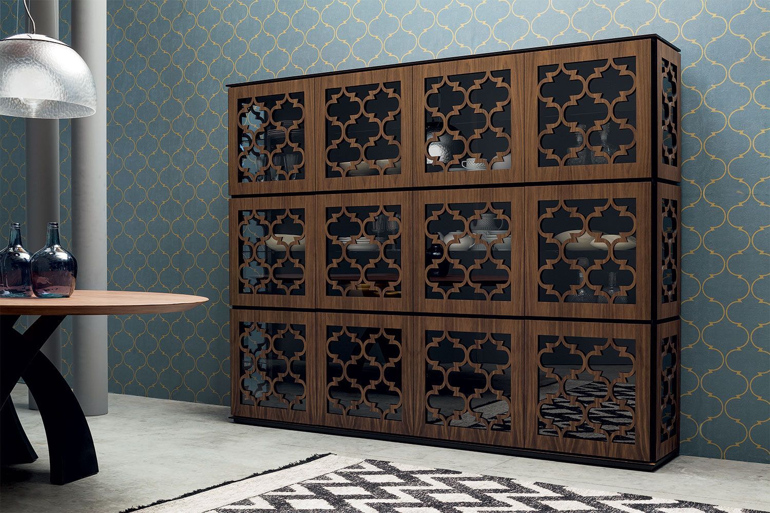 Prezentacja Marrakesh firmy Tonin Casa jest idealna do obszarów wymagających ekspozycji i przechowywania. Wycięcia na drzwiach przyciągają wzrok i sprawiają, że jest to piękny punkt centralny w nowoczesnym domu. Dzięki mocnym i solidnym półkom jest wystarczająco dużo miejsca na elegancką porcelanę i inne przedmioty, wszystko z łatwością pomieści. Wyeksponowanie elementów wystroju domu na górze dodaje gustu. Wyprodukowana we Włoszech w celu zapewnienia jakości, dostępnych jest kilkanaście konfiguracji, a opcjonalne światło LED z pilotem lub bez. Struktura jest dostępna w różnych wykończeniach drewnopodobnych, a panel tylny może pasować do drewna lub mieć brązowe lustrzane wykończenie.