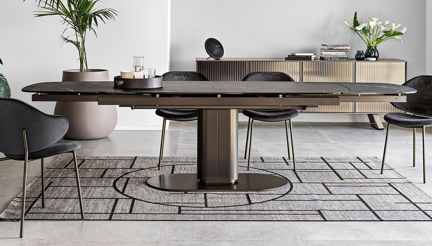 Cameo stół o ostro zarysowanej owalnej sylwetce, która nadaje mu silną osobowość i nie tylko zapewnia stabilność, ale pozwala maksymalnie wykorzystać przestrzeń pod blatem. Wykonana z powlekanego metalu kolumna centralna obsługuje różne typy blatów; połączenie metalu i drewna jest niezmiennie wyrafinowane, podczas gdy mieszanka metalu i ceramiki z efektem marmuru tworzy kontrast między zimnymi i ciepłymi materiałami i jest niesamowicie nowoczesna.