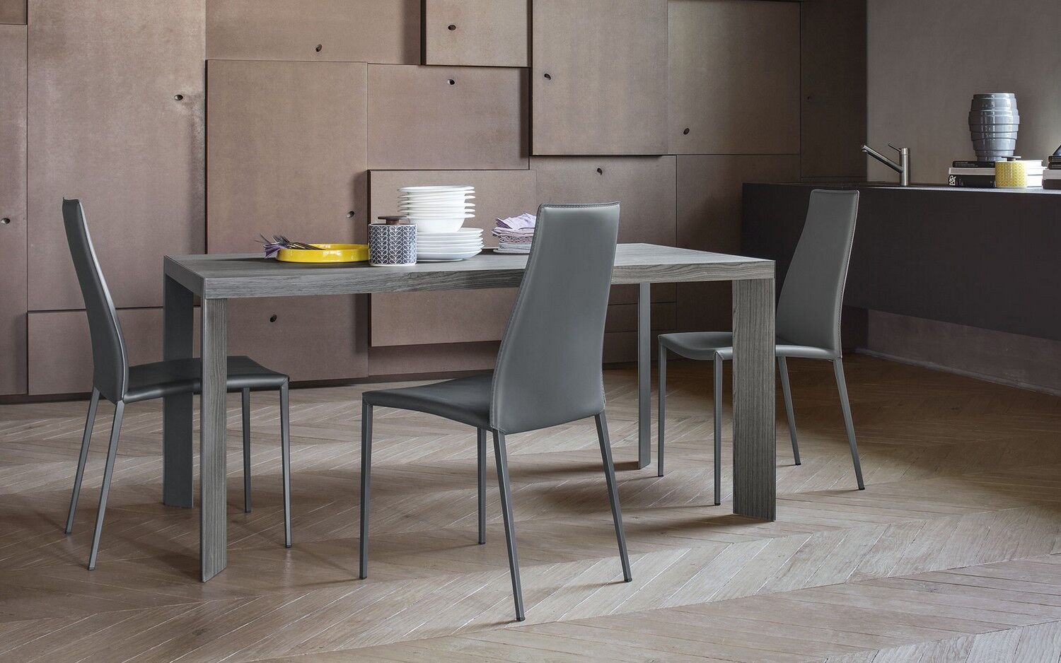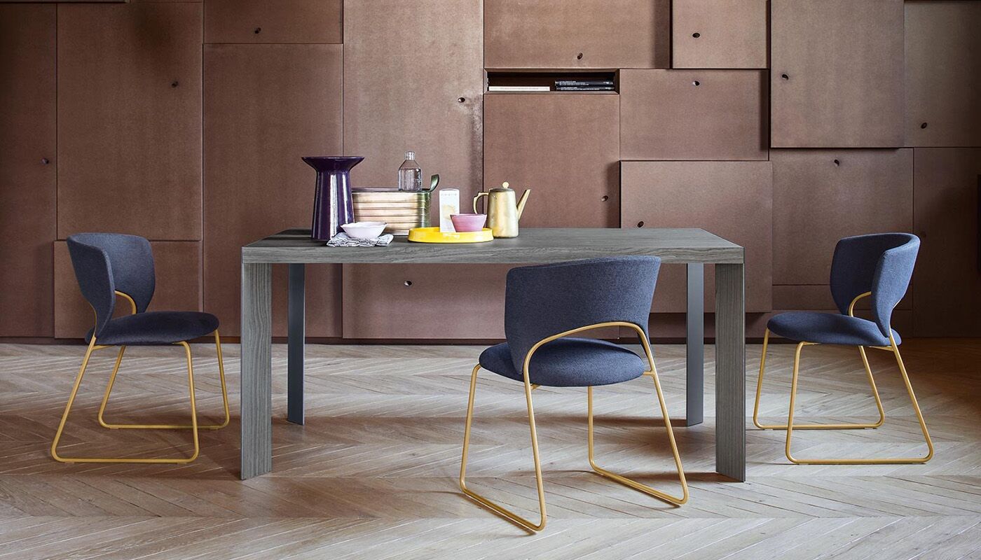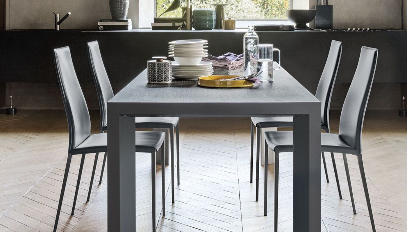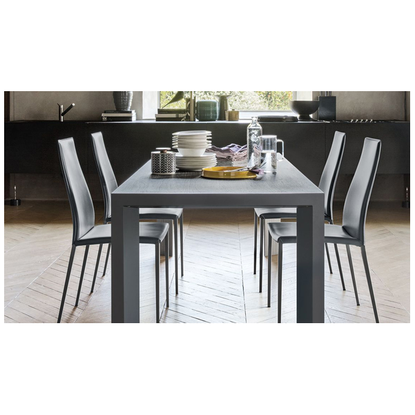 Stół posiada doskonale zintegrowany system ukryty w ramie: nogi przesuwają się na jedną stronę, co pozwala na umieszczenie na miejscu nadstawki w kolorze blatu. W ten sposób nogi zawsze pozostają w rogach, a ich walory estetyczne, wynikające z ukośnego ułożenia i powlekanego profilu metalowego, są podkreślone. Lam oferuje niezliczone możliwości kombinacji zarówno w środowisku domowym, jak i roboczym. Wybierz go, aby dodać charakteru do jadalni lub gabinetu.