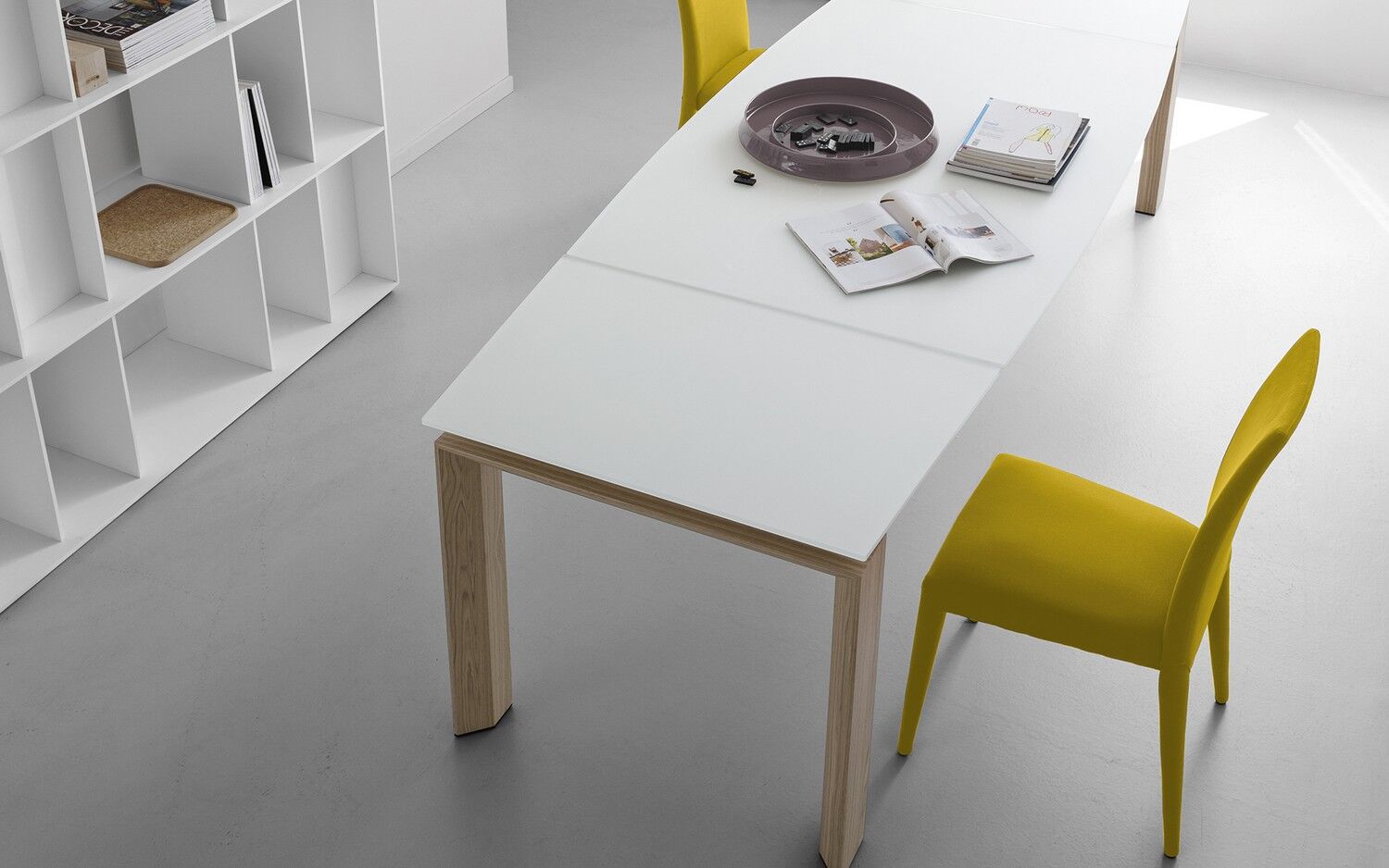 Stół z prostokątnym rozkładanym szklanym blatem i drewnianymi nogami. Moving z blatem w kształcie cygara: prostokątny z zaokrąglonymi długimi bokami. Bardzo długi stół rozkładany. Zastosowanie najnowocześniejszej technologii - opatentowanego teleskopowego mechanizmu wysuwanego skrzydła - pozwoliło nam stworzyć super rozkładany stół, którego długość można podwoić jednym, praktycznym ruchem. Naciskając uchwyty na krótkim końcu i pociągając do siebie, listwy przedłużające wysuwają się kolejno spod blatu i ustawiają się automatycznie. Nogi wykończone drewnem lub metalem pozostają na rogach, zapewniając tym samym najwyższy komfort wszystkim gościom. Różnorodność materiałów i wykończeń dostępnych dla stołu Moving pozwala na różnorodne kombinacje, aby zaspokoić wszelkie potrzeby wyposażenia.
