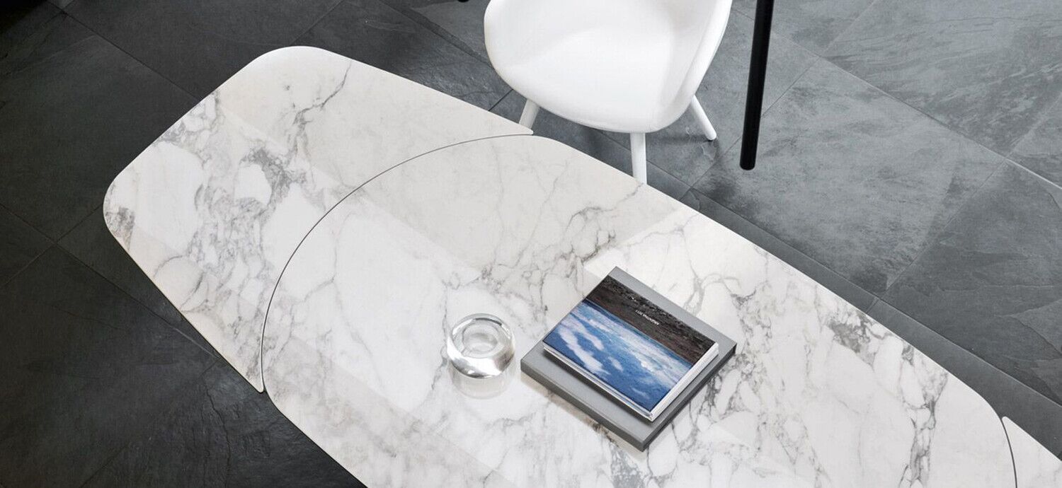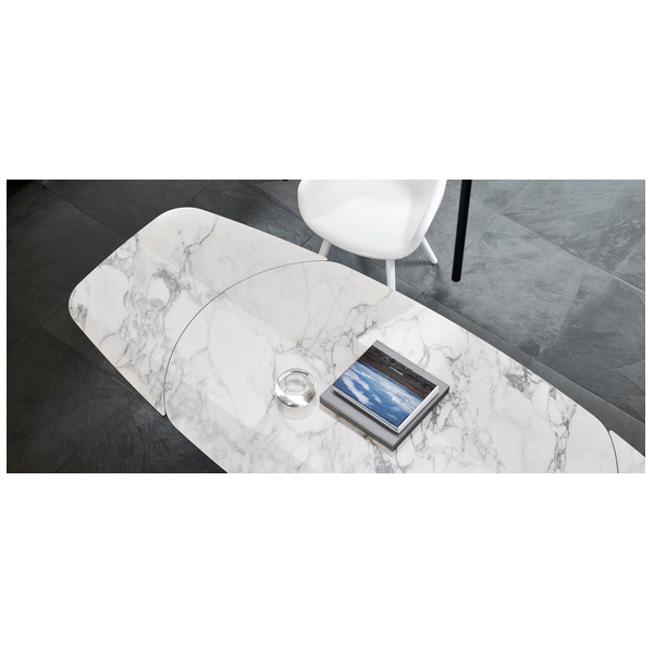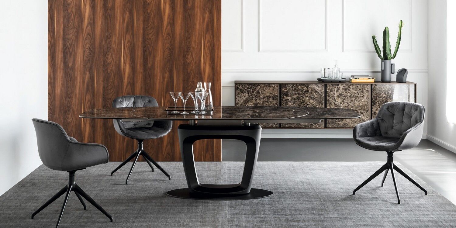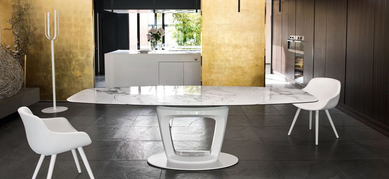 Stół rozkładany Orbital, podstawa i eliptyczny blat. Pininfarina Design. Stół Orbital posiada zaawansowany technologicznie system automatycznego rozkładania. Dzięki jednemu płynnemu ruchowi metalowych ramion, dwa wysuwane blaty wysuwają się spod ceramicznego blatu i jednocześnie ustawiają się na tym samym poziomie, zachowując eliptyczny kształt stołu. Urządzenie blokujące zapobiega przypadkowemu zamknięciu. Podstawa cokołu ze sztywnego poliuretanu z dużym centralnym otworem i metalowa płyta nośna zapewniają stabilność ramy. Orbital to zaawansowany technologicznie stół rozkładany o przemyślanym designie, stanowiący malowniczą obecność w Twoim domowym zestawie, prawdziwy bohater Twojej jadalni.