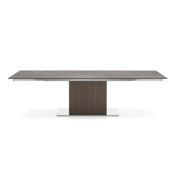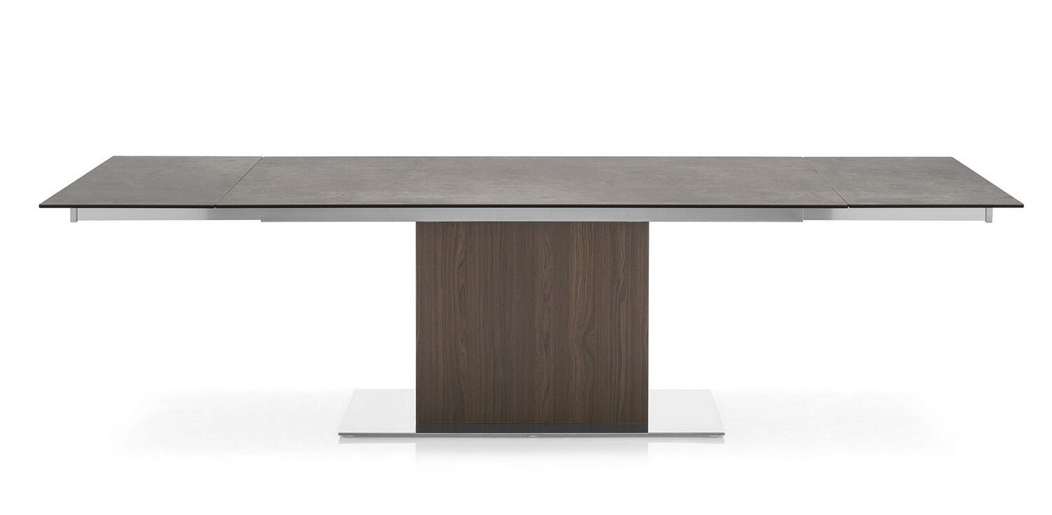 Park to wyjątkowo długi rozkładany stół z szerokim prostokątnym blatem, który spoczywa na solidnej drewnianej podstawie z chromowaną blachą. Dwa boczne skrzydła przedłużające można zdejmować pojedynczo, wystarczy pociągnąć do siebie, aby wsunąć je od spodu blatu i wyrównać prostym ruchem. Park to efektowny wizualnie stół rozkładany, idealny do wyposażenia przestronnej jadalni z elegancją, może wygodnie pomieścić do 12 osób.