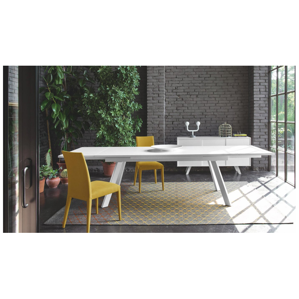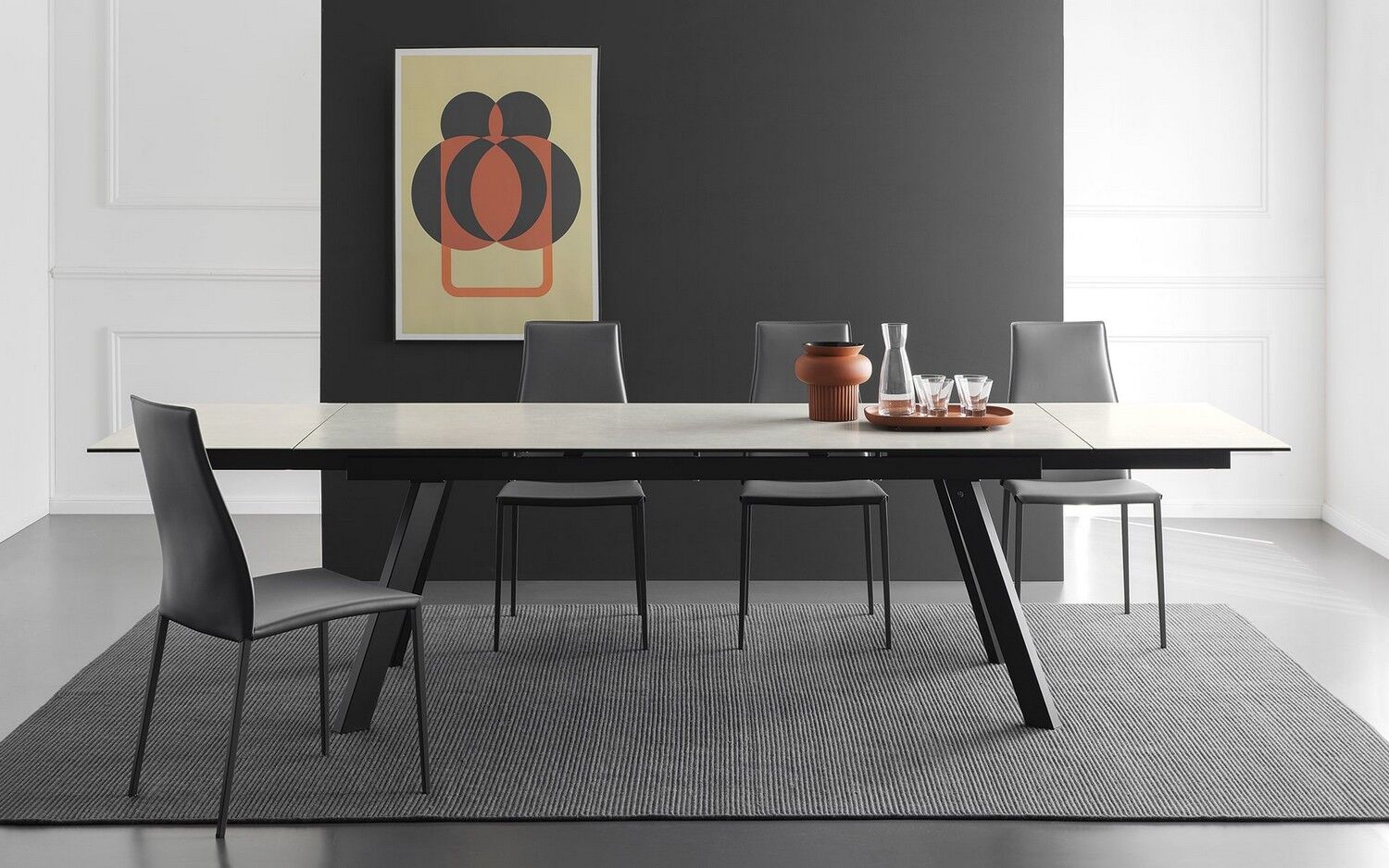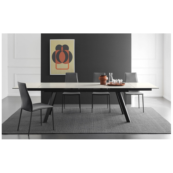 Rygor, formalność, solidność. Stół rozkładany Ponente ma dynamiczny i nowoczesny design. Konstrukcja jest wykonana z powlekanego metalu z pochyłymi nogami o przekroju prostokątnym, przyspawanymi do ramy.