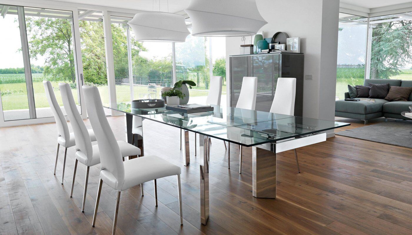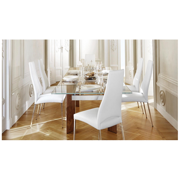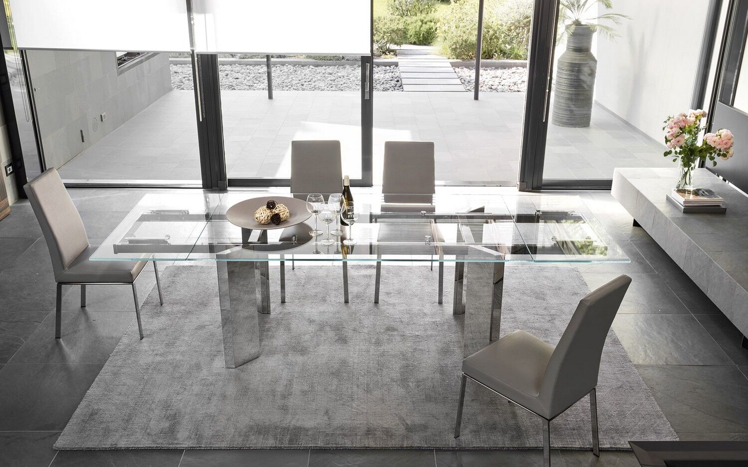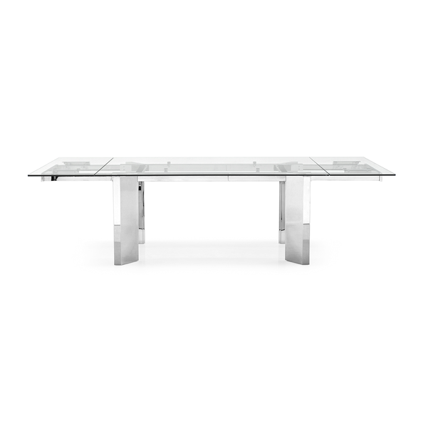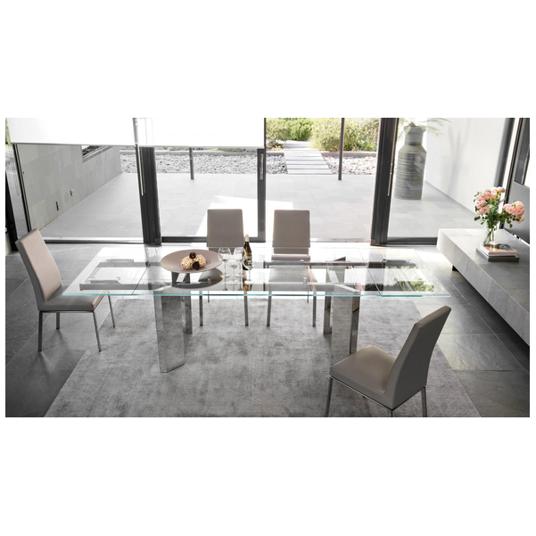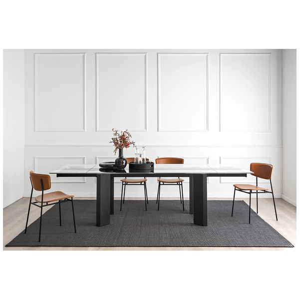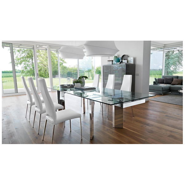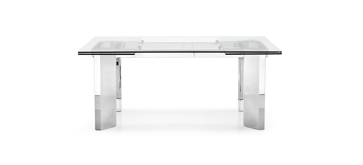 Stół rozkładany Tower ma drewniano-metalową ramę z prostokątnym blatem szklanym lub szklano-ceramicznym. Dwa boczne przedłużenia można wyciągać pojedynczo, wystarczy pociągnąć je do siebie, aby wysunąć je spod blatu i wyrównać jednym prostym ruchem. Po rozłożeniu wygodnie pomieści do 10 osób.