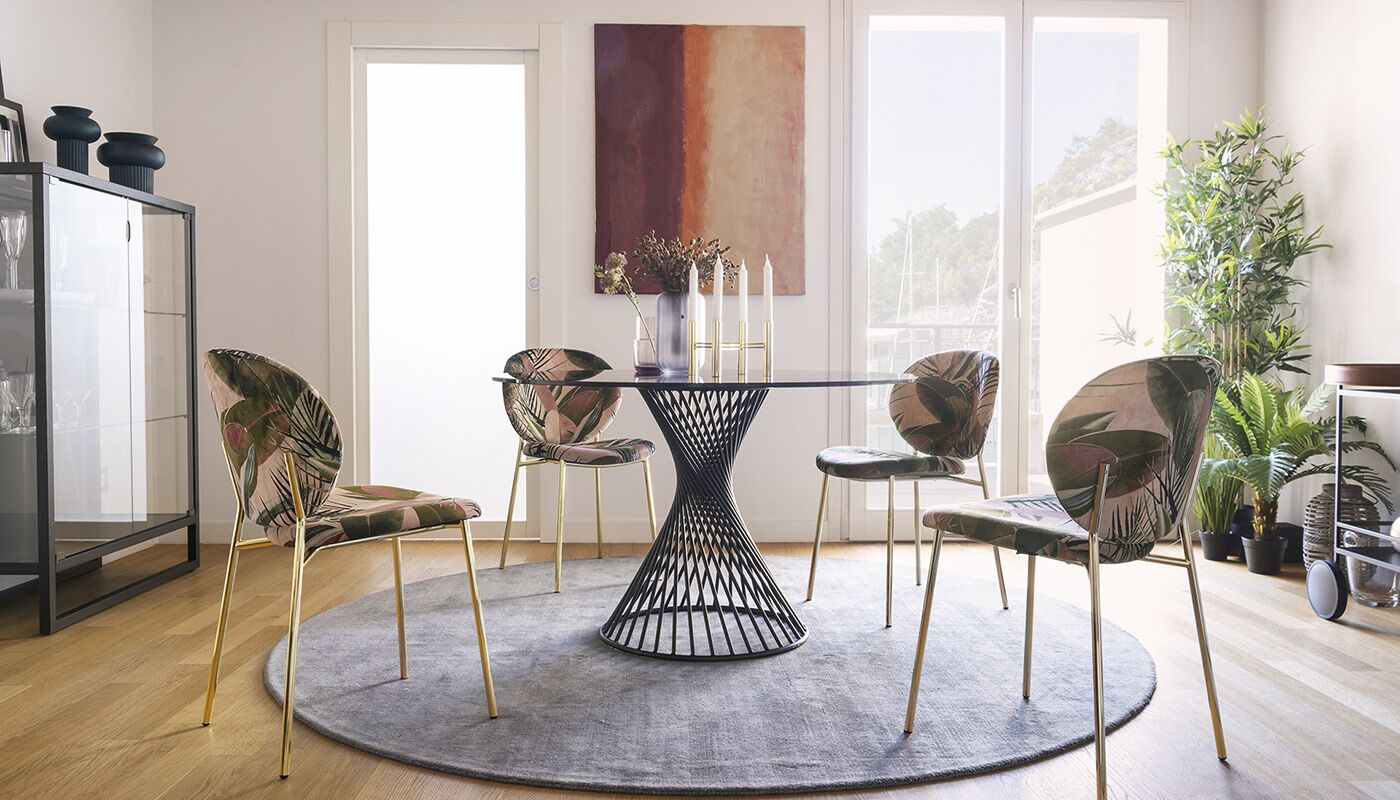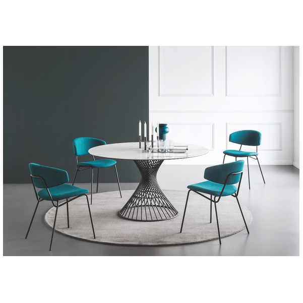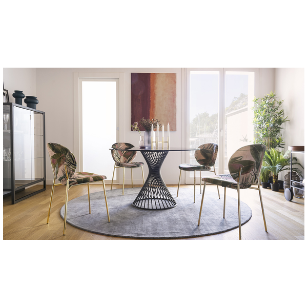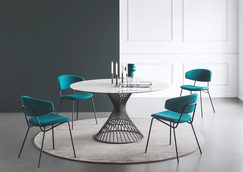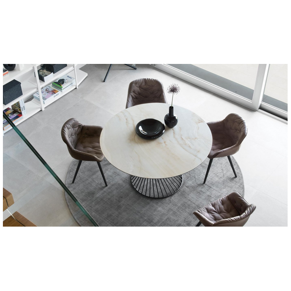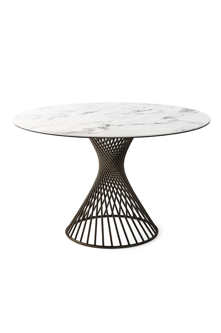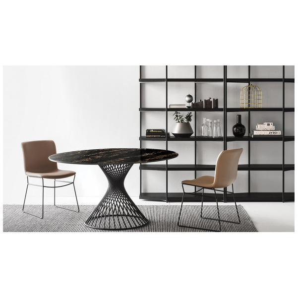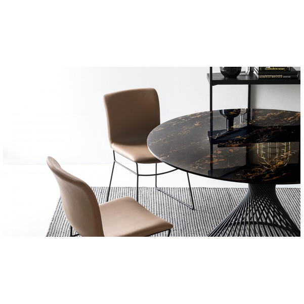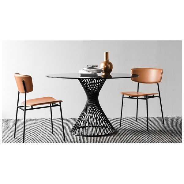 Okrągły stół Vortex tworzy silne poczucie przynależności między ludźmi, wspomagając rozmowę po prostu swoim kształtem. Wrażenie to jest podkreślone przez Vortex dzięki dekoracyjnej i funkcjonalnej centralnej podstawie, która dzięki spiralnej ramie z metalowej rury nadaje stołowi osobisty charakter. Szklany lub szklano-ceramiczny blat doskonale komponuje się z metalową podstawą i jest przymocowany do ramy za pomocą trzech okrągłych stalowych płyt.