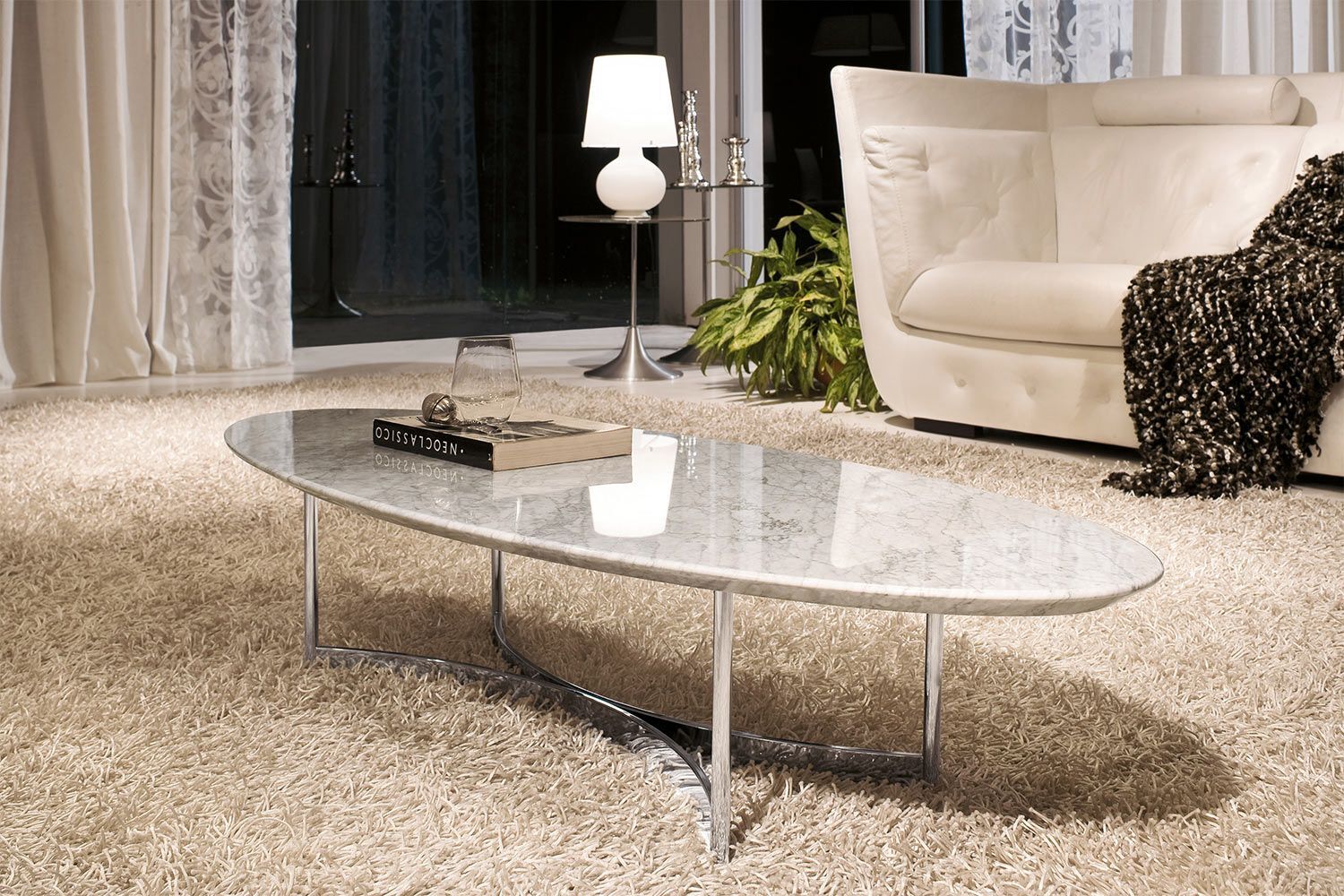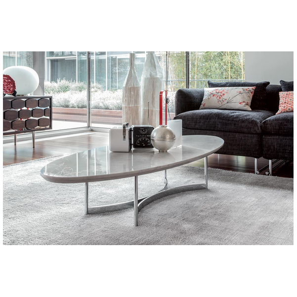 Stolik kawowy Parioli, przypominający deskę surfingową, wyróżnia się w nowoczesnym salonie. Dwustronna metalowa podstawa wygina się do wewnątrz po obu stronach, co przyciąga wzrok. Dzięki dużej ilości miejsca na górze jest wiele możliwości dekoracyjnych, a także miejsce na napoje, przekąski i piloty. Dostępne są dwa rozmiary, blat ma różne wykończenia marmuru. Podstawa ma różne metalowe wykończenia.