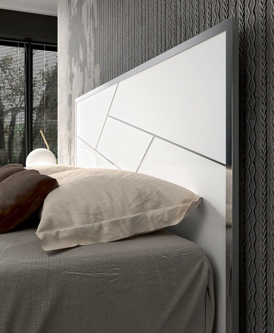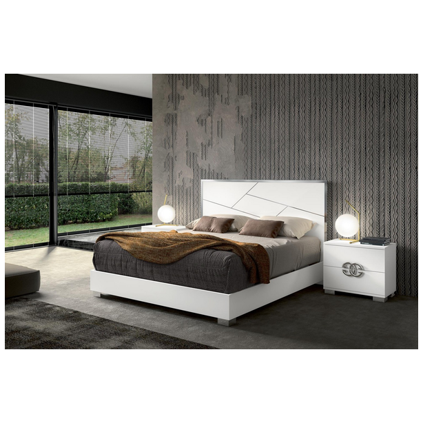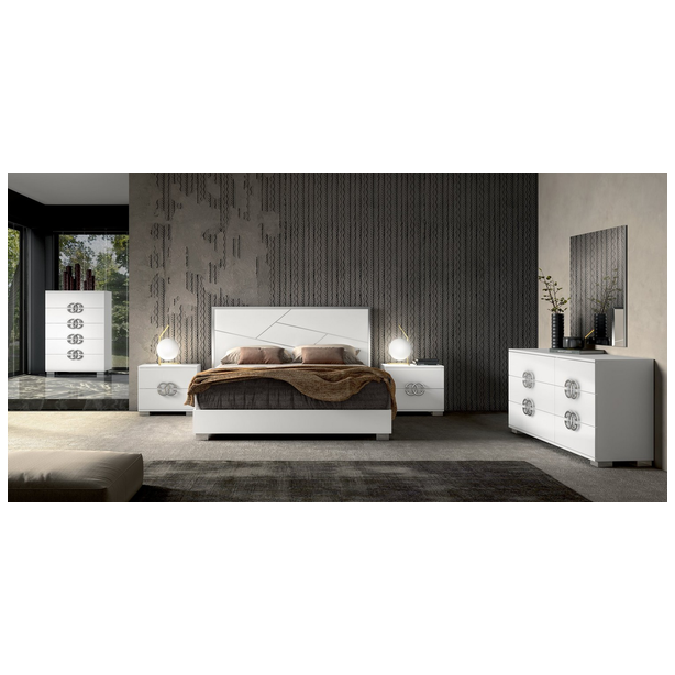 Włoska sypialnia Dafne charakteryzująca się pięknem designu, prostotą formy i zachwycającymi wykończeniami. W kolekcji znajduje się podwójne łóżko z szerokimi ramami, niskimi metalowymi nogami i drewnianymi zagłówkami ze stalowym dekorem. Zestaw uzupełniają także szafki nocne, komody, szafy i lustra. Materiałem do produkcji jest płyta MDF pokryta ekologicznymi błyszczącymi białymi lakierami, których nakładanie odbywa się w kilku etapach. Ponadto zestaw zdobią chromowane elementy ze stali, efektowne uchwyty, lustra, a wysokiej jakości wyposażenie wnętrza daje właścicielowi maksymalny komfort.