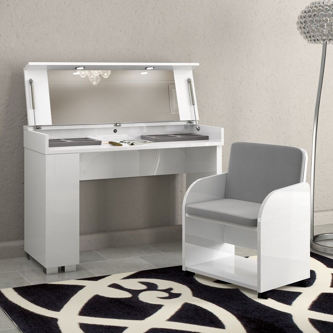 Wykwintna Sypialnia Dream firmy Status to elegancka kolekcja - 100% Made in Italy z naciskiem na włoską kulturę, wieloletnie doświadczenie i kreatywne podejście rzemieślników do tworzenia mebli. Do wykańczania powierzchni stosuje się nietoksyczny biały lakier z aplikacją w kilku etapach. Dopełnieniem zestawu są stalowe nogi, uchwyty, polerowane chromowane elementy, lustra, wbudowane oświetlenie LED, eko-skóra kroko i beż Vermont do tapicerki.