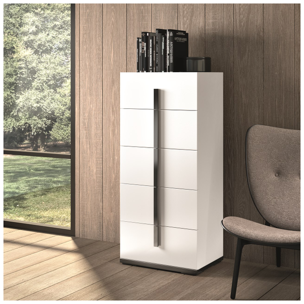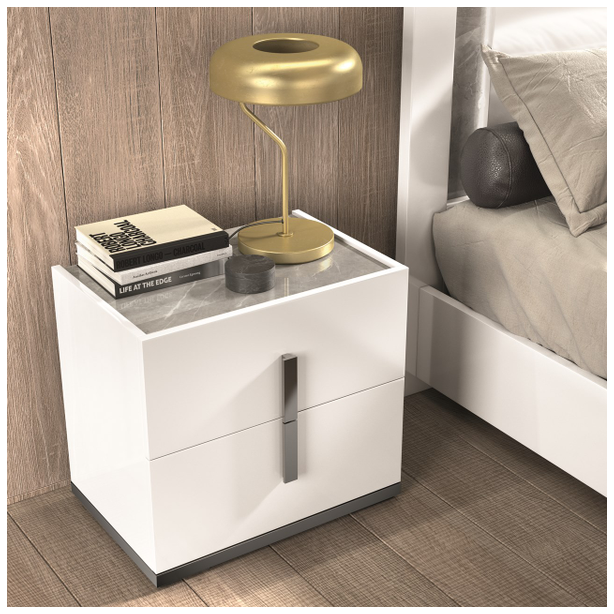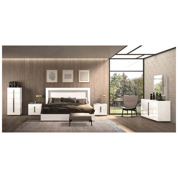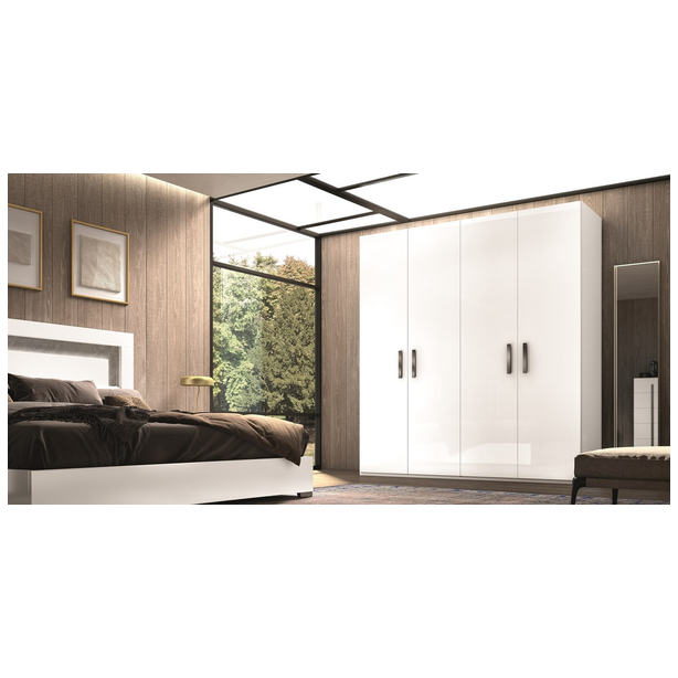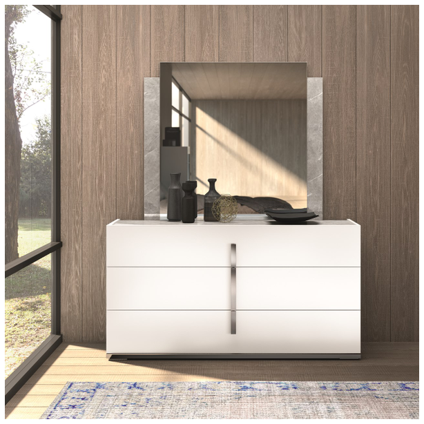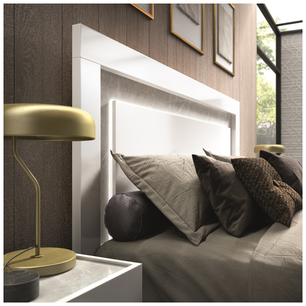 Sypialnia Mara to eleganckie meble charakteryzujące się pięknem wzornictwa, prostotą i lakonizmem form oraz zachwycającymi wykończeniami, dzięki zastosowaniu innowacyjnych materiałów. W kolekcji znajdują się podwójne łóżko z szerokimi ramami, niskimi metalowymi nogami i drewnianymi zagłówkami z matową stalową dekoracją. Zestaw uzupełniają także szafki nocne, komody, szafy i lustra. Materiałem do produkcji jest płyta MDF pokryta ekologicznymi błyszczącymi białymi lakierami, których nakładanie odbywa się w kilku etapach. Całość zdobią również elementy ze stali polerowanej i matowej, efektowne uchwyty, lustra, wspaniały design blatu komody i postumentów, a wysokiej jakości wyposażenie wnętrza daje właścicielowi maksymalny komfort.