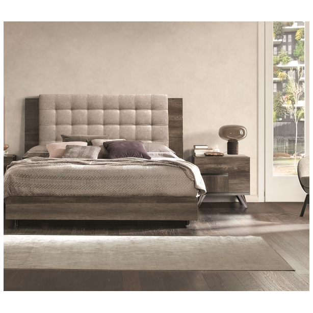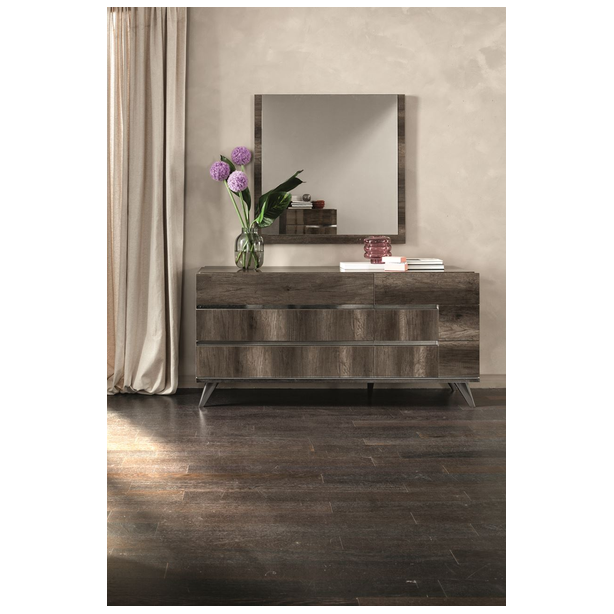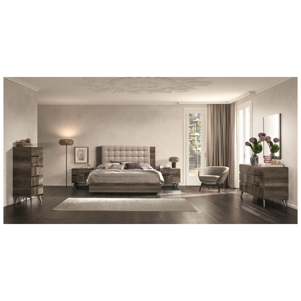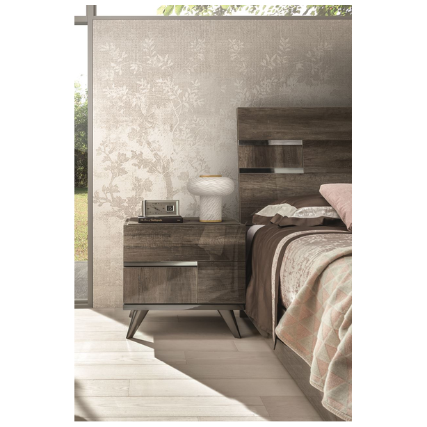 Nowoczesna sypialnia Medea to elegancka kolekcja zawierająca niezbędne atrybuty wnętrza, które pozwolą na zwięzłe i stylowe zaaranżowanie przestrzeni. Znajdują się tu łóżko z drewnianym wezgłowiemi, szafki nocne, komody z fazowanymi stalowymi nogami, wiszące lustra wykonane z materiału imitującego dąb, pokrytego błyszczącymi lakierami, których aplikacja odbywa się w kilku etapach. Ponadto elewacje ozdobione są stalowymi wstawkami polerowanymi i matowymi. Zagłówek łóżka może być wykonany w miękkiej, lekkiej ekoskórze.