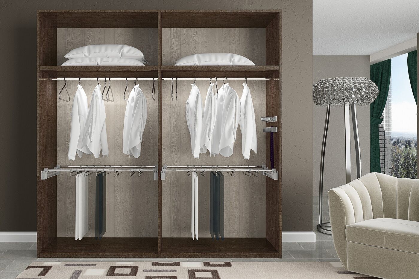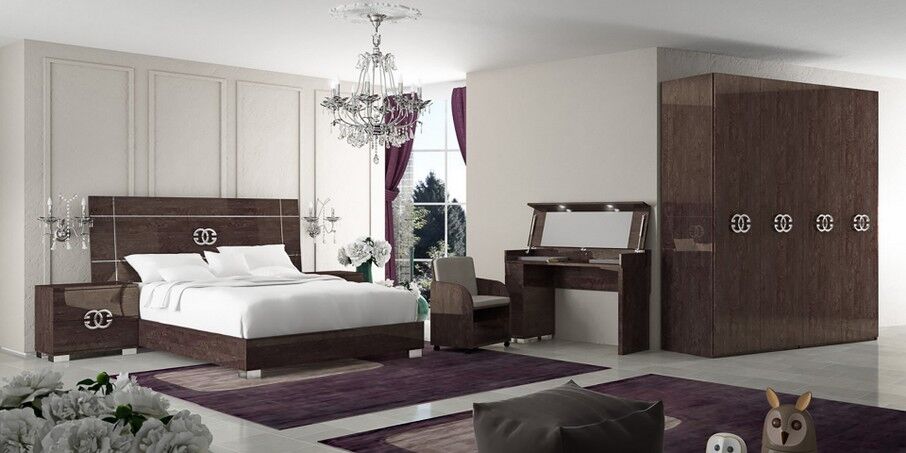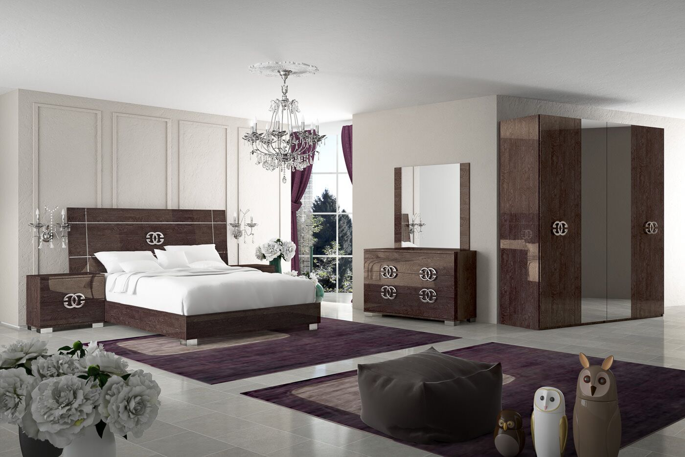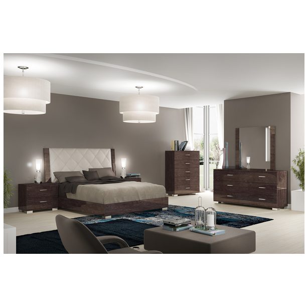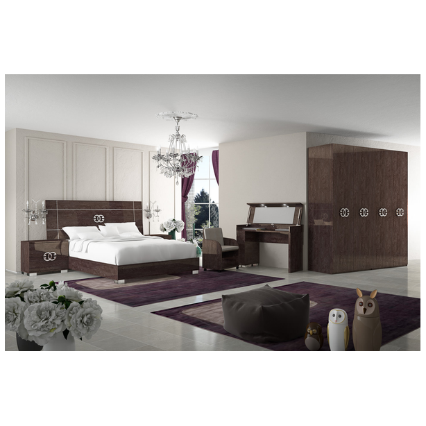 Włoska sypialnia Prestige to stylowa kolekcja, która wypełni wnętrza atmosferą wyjątkowego szyku i harmonii. W kolekcji znajdują się podwójne łóżko na solidnych stelażach, niskich metalowych nogach, z zagłówkami, obszyte miękką tapicerką i stalowym dekorem. Zestaw uzupełniają także szafki nocne, komody, szafy, toaletka, fotele i lustra. Wykończenie mebli brzozowe pokryte ekologicznymi lakierami błyszczącymi z aplikacją w kilku etapach. Na tapicerkę i zagłówek wybrano beżową ekoskórę z przeszyciami. Efektowne uchwyty i dekor wezgłowia - chrom polerowany, podkreślający wyjątkowość zestawu.
