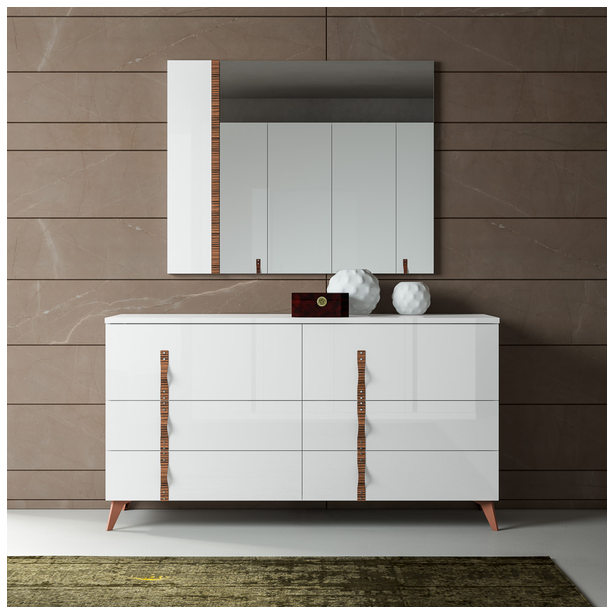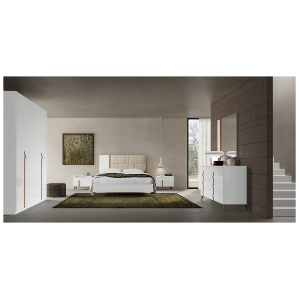Wyrafinowanie i dbałość o szczegóły. Stylowy, nowoczesny zestaw do sypialni Sirio, wyprodukowany we Włoszech przez Status, ma białe wykończenie na wysoki połysk, drewniane akcenty z nogami w tym samym kolorze i zagłówkiem obitym ekoskórą. Łóżko ma stelaż z drewnianych listew. Zestaw składa się z łóżka typu queen size, 2 szafki nocne, podwójna komoda i lustro.