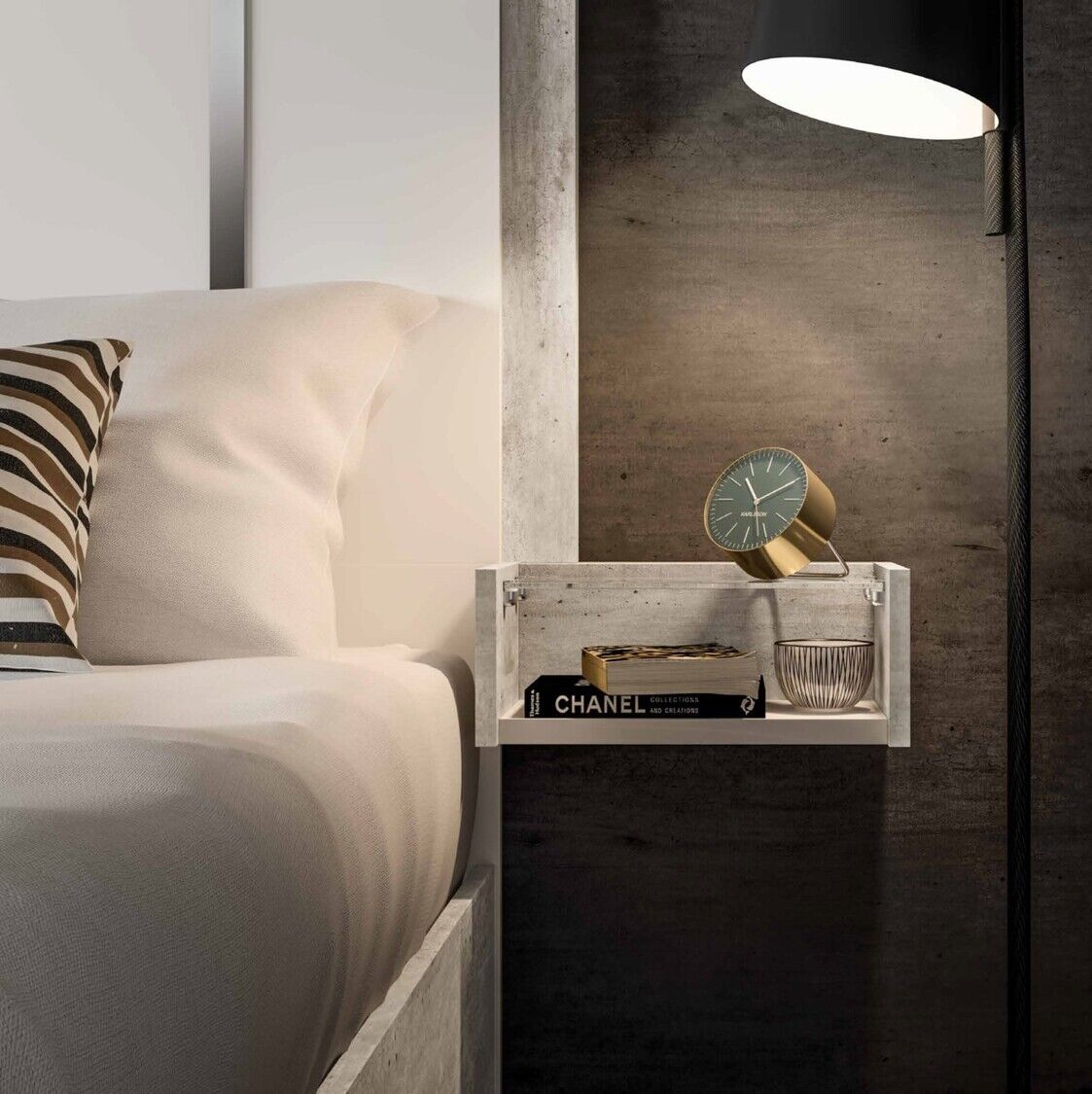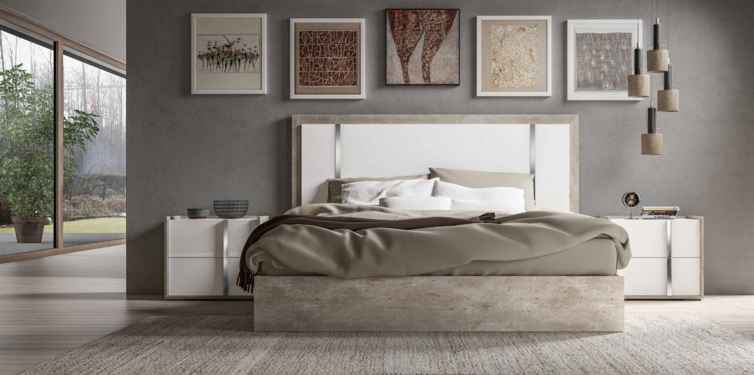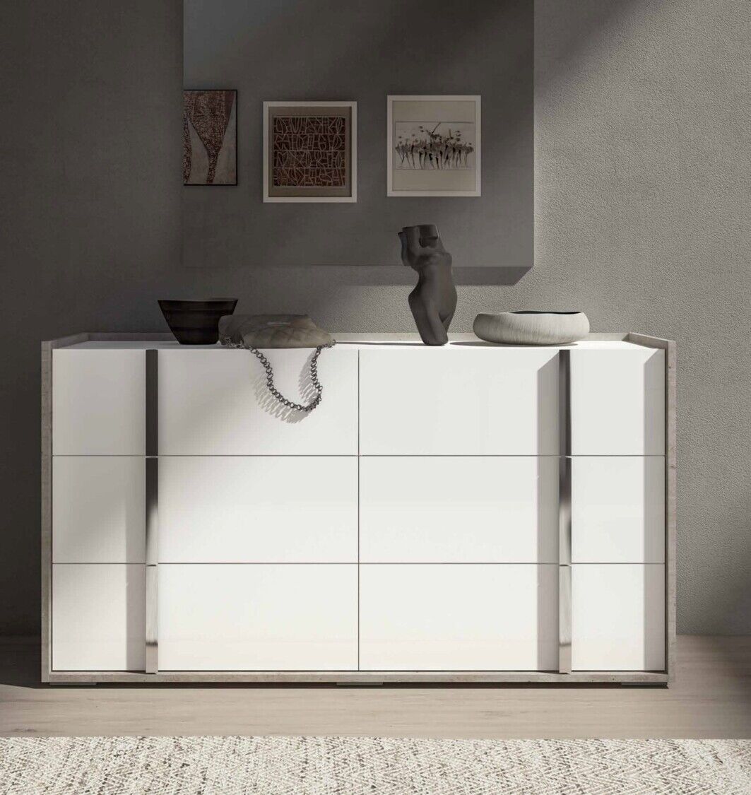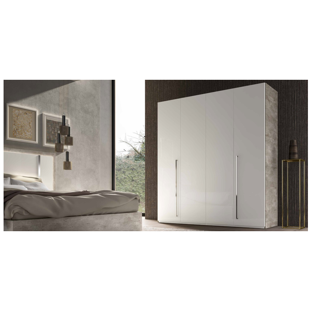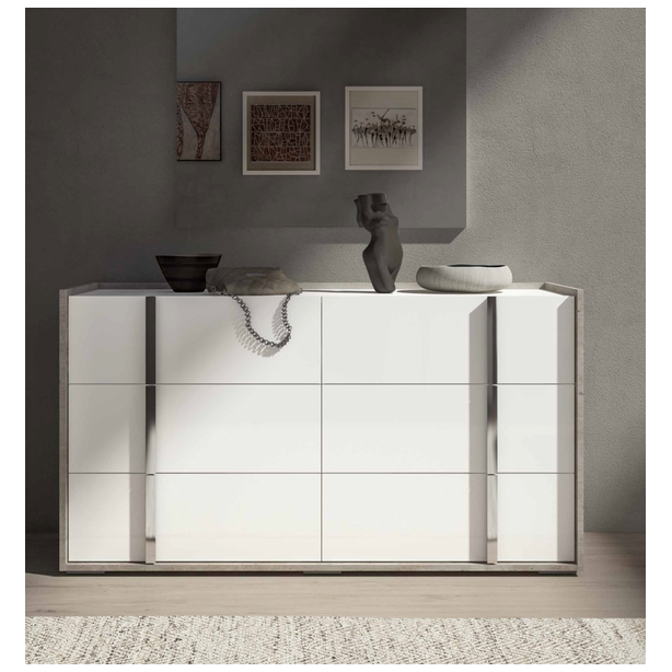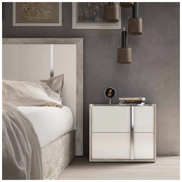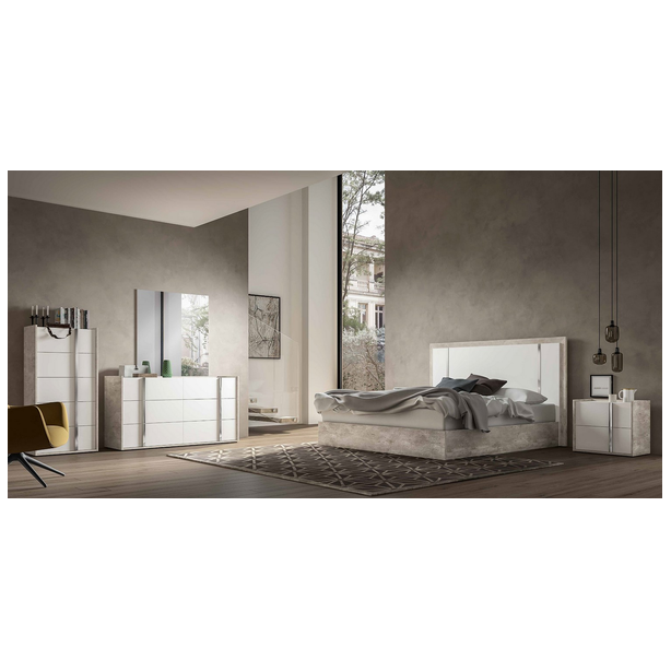 Sypialnia Treviso to nowoczesny mebel, który uosabia piękno i wszechstronność. Oryginalny dobór nowoczesnych materiałów, różnorodne techniki produkcji i wykończenia pozwalają stworzyć wykwintny zestaw. Meble prezentowane są w wykończeniu białym błyszczącym lakierem z aplikacją kilkuetapową, laminat - imitacja cementu, z elementami stalowymi w wykończeniu polerowanym chromem oraz lustrami. Takie kreatywne rozwiązanie projektowe, wieloletnie doświadczenie produkcyjne, tworzenie mebli przez pryzmat kultury włoskiej – to wszystko to meble Status 100% Made in Italy.
